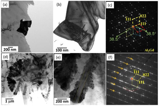 Gd is one of the most frequently used RE elements in wrought Mg-RE-based alloys, because it has a very high solid solubility in Mg and is widely accepted as being favorable for improving alloys’ plasticity and strength [,,]. Qin et al. [] studied the microstructural and mechanical properties of HPDC AGd44 (Mg-4Al-4Gd-0.3Mn, wt%). Different from the AE44-based alloys with other RE elements, as stated in the above, there were much fewer intermetallic particles in the HPDC AGd44 alloy, and only blocky and petaloid particles were observed. After aging at 200 °C for 48 h, there were no discernible changes to the pre-existing intermetallic phases, while some fine lath-like precipitates with relatively low contrast formed at the grain boundaries. The TYS of the AG44 alloy was improved by ~30 MPa. TEM examinations showed that most of the blocky particles were Al2Gd (face-centered cubic structure, a = 0.79 nm [,]), while the lath-like precipitate was Mg17Al12 following the reported Pitsch–Schrader OR or Burgers OR with the Mg matrix []. The blocky Al2Gd particles consisted of several parts, and each part possibly contained profuse planar faults such as twin boundaries (Figure 9a–c). In addition, the twinned Al12Gd2Mn5 domains were frequently found embedded in Al2Gd phases. Petaloid particles were also observed in the AGd44 alloy, but its petals were different from those of the petaloid Al2Sm in which center axes are found and are round by amounts of small Al2Gd cells (Figure 9d–f).