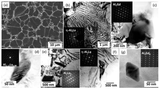 (a) SEM image of ALaGd432 alloy and (b–g)TEM images along with the corresponding SAED patterns (the inserts) of the intermetallic phases [].