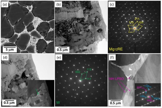 Easton et al. [] reported that more than 0.5 wt% Zn addition into Mg-Nd-based alloys can improve the mechanical properties, but it also clearly increases the hot tearing susceptibility. However, Choudhuri et al. [] added 0.8 wt% Zn into an HPDC Mg-3.6Nd-2.3La alloy and found that Zn addition markedly improves an alloy’s creep resistance properties. In addition, they attributed this to the fact that Zn lead to the formation of γ” (ordered hexagonal structure, a = 0.56 nm and c = 0.45 nm []) precipitates during creep. Recently, Hua et al. [] studied the microstructural and mechanical properties of an HPDC Mg-2La-3Y-0.3Mn alloy with 4 wt% Zn addition. Indeed, this alloy was very brittle, and only the compressive strength and ductility were reported, as listed in Figure 1. However, it has to be noted that its TYS was very high, such as ~202 MPa, which is comparable with that of the AEX422 alloy []. The 4 wt% Zn addition changed the morphologies of the grain boundary particles, leading to the dominant intermetallic phases irregularly aggregating together (Figure 12a). TEM examinations (Figure 12b–e) identified that the relatively dark intermetallic phase was Mg12RE (body-centered tetragonal structure, a =1.052 nm and c =0.596 nm []) and the bright one was the W phase (face-centered cubic structure, a = 0.684 nm [,]). Moreover, a few of LPSO plates were found in this alloy (Figure 12f).