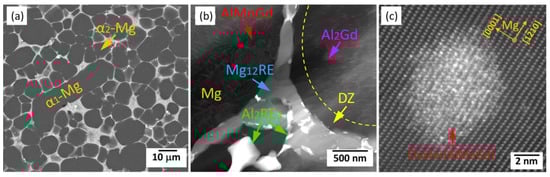 (a,b) SEM images of the aged Mg-3.5RE(La,Ce,Nd)-1.5Gd-0.5Al-0.3Mn sample and (c) an atomic-resolution HAADF-STEM image of AlMnGd cluster [].