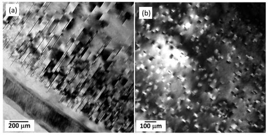 (a,b) TEM images showing fine plate-like precipitates in the heat-treated AEX422 alloys [].