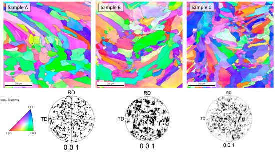 The cellular structure described above was very difficult to describe quantitively due to large differences in apparent cell size caused by the direction of the metallographic cross-sections. For that reason, the cell size analysis was not performed because, with such high uncertainty of the results, the apparent trend might be more correlated with the chosen observation area than with the processing parameters. Additionally, it must be remembered that the cells that can be clearly seen using the optical microscope were not grains according to the typical definition of the grain, and only cross-sections of the dendrites formed during rapid solidification. For that reason, electron backscatter diffraction (EBSD) analysis was performed to reveal the real grain structure, where grains were defined as areas divided by high-angle grain boundaries. EBSD analysis was also performed to identify phases other than the austenite phase (especially ferrite and possibly sigma) as well as to measure the real grain size. Observations were taken at two magnifications, 200× and 2000×, and the first ones are shown in Figure 5. Crystallographic orientation maps and pole figures suggest that the grains were oriented randomly, and thus no texture was visible in the observed areas. This was quite an unusual finding in consideration of the nature of the additive manufacturing process, which very often results in the preferred orientation of the grains due to the specific solidification conditions. Phase analysis performed with EBSD showed no occurrence of the alpha phase (ferrite). Exemplary results from the EBSD observation are given in Figure 5. Again, due to the very elongated grains and uniaxial grains that are visible in the picture, as well as relatively bad statistics even at such low magnification (large grains), the quantitative analysis was considered to be unreasonable. In contrast to the EBSD results for small areas, the results obtained from XRD phase analysis showed significant texture, which could be judged from the difference in the relative intensities of the obtained XRD patterns compared to the reference PDF card. This observation further supports the finding that the preferred orientation and texture were strongly dependent on the scale at which the sample is observed. Moreover, in the case of additive manufacturing, more than in the case of any other manufacturing techniques, the result of the observation was extremely dependent on the area that was observed as well as the direction in which the sample was cut, especially in bulk (not thin-walled) structures. For that reason, it was finally decided not to calculate the grain size, even after the EBSD examination. At the microscale, a randomly chosen area may be within a single clad of unknown direction, and thus, its average crystal orientation is likely not to be representative of the total volume of the material. Therefore, the local crystallographic orientations may be interesting to some extent from the informational point of view; however, they do not influence the macroscopic properties of the material. The most important information obtained from EBSD was that no ferrite was observed in the samples. Due to the specific cooling conditions, despite the chemical composition (high nickel content), in the case of additively manufactured samples, it is possible that delta ferrite exists due to local deviation of the chemical composition as well as extremely fast cooling [29].