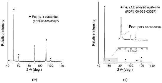 The feedstock material used to manufacture the test samples was AISI 316L steel powder (TLS, Germany). The as-received gas (argon) atomised powder was additionally sieved in a vibrational sieving station for 50 min to obtain a fraction from 44 to 106 μm. The post-sieving particle size analysis (IPS-U, Kamika, Poland) showed that approximately 97% of the particles were within the desired particle range; the particles were almost perfectly spherical (Figure 1a). For the macroscopic examination, samples were ground, polished, etched (swabbing by ASTM E407 Kallings Etchant) and observed using metallographic microscopy (KEYENCE VHX-950F). To examine the microstructures, all samples were observed using optical microscopy (Nikon Eclipse MA200) as well as SEM (FEI, QUANTA 3D) in SE mode. Observations by optical microscopy of the cross-sections of the particles (fixed in thermoset resin) revealed no internal porosity in the powder (Figure 1b) and no significant amount of so-called satellites, which should not influence the powder flowability. The chemical composition and particle shape were confirmed by scanning electron microscopy (SEM) (Quanta 3G FEM Dual Beam, FEI) observation and EDS analysis and corresponded well with the nominal composition of 316L steel. The amount of carbon was not evaluated quantitatively due to the measurement limitations of energy-dispersive X-ray spectroscopy (EDS) for light elements. The EBSD analysis was carried out at a voltage of 20 kV. Data were collected at two magnifications of 200 and 2000 times in steps of 3 and 0.3 micrometers, respectively. Grain boundary analysis was performed assuming two angular ranges from 2 to 15 degrees and above 15 degrees. The STEM images were taken with the use of a Hitachi HD2700 microscope, with 200 kV acceleration voltage and a HAADF detector. The phase composition of the obtained samples was investigated based on X-ray diffraction spectroscopy (XRD) patterns collected with the use of an Ultima IV (Rigaku, Japan) diffractometer with a cobalt anode (Kα1 λ = 1.788965 Å), parallel beam geometry and a linear DeteX Ultra counter. A cobalt anode was used to avoid fluorescence and to obtain low noise measurements. Parallel beam geometry also reduces the Kβ radiation contribution to less than 1% of the intensity.