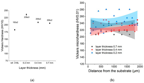 (a) Hardness as a function of the layer thickness compared with the reference sample; (b) microhardness distribution as a function of distance from the substrate.