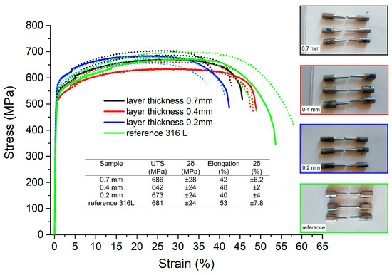 The results of the tensile test are shown in Figure 8. After calculating the average ultimate tensile strength (UTS) and yield strength (YS) values and estimating the uncertainties (measured as double standard deviation 2δ), it was concluded that there were no statistically meaningful differences between the tensile properties of both additively manufactured and reference samples. The only measurable difference was seen between the elongation observed for the reference sample (53 ± 7.8%) and the sample with the smallest layer thickness (40 ± 4%).