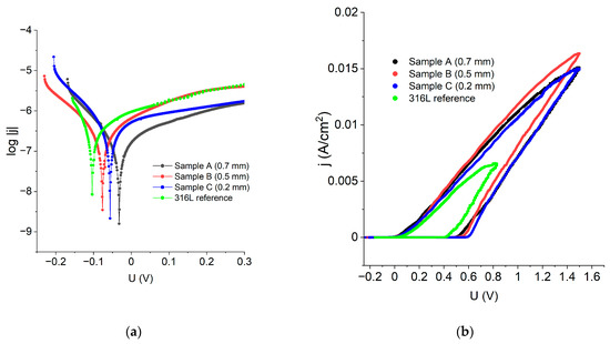 (a) polarization curves, in log|j|vs. E coordinates of the samples obtained via additive manufacturing and a reference 316L sample; (b) polarisation curves of the samples obtained via additive manufacturing and a reference 316L sample.