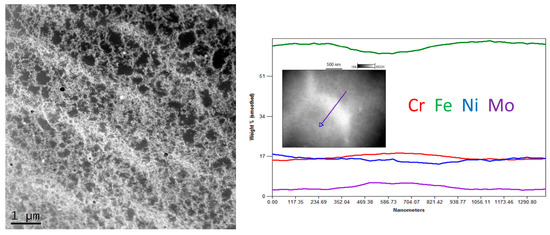 The STEM observation together with EDS line scan analyses showed quite a noticeable chemical segregation at grain boundaries, as in Figure 10. After a thorough analysis of all the results of the research, it was concluded that the difference in the colour of the grain boundaries resulted from a greater density of dislocations at the grain boundaries than in the grains. Another reason for this difference may have been the same etching process, which operated more strongly on the borders than the grains. It was therefore concluded that the characteristic microstructure in the form of a net or ichthyosis was a purely austenitic microstructure with a dendritic and cellular morphology formed on the original net of delta ferrite, with a greater density of dislocations distributed on the grain boundaries. Significant segregation of molybdenum is also noticeable. As already discussed [24,32], the three-dimensional network with different chemical segregations and significantly different dislocations density causes the increase in stability of the protective film formed during passivation, thus increasing the corrosion resistance.
