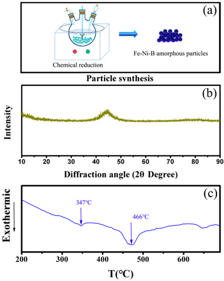 The sketch of Fe-Ni-B particle preparation (a); XRD patterns of Fe-Ni-B particles (b); DSC curves of Fe-Ni-B particles (c).