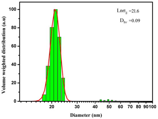 Figure 4 demonstrates the hydrodynamic diameter of the amorphous Fe-Ni-B magnetic nanoparticles. Samples for DLS tests were obtained via suspending dry amorphous magnetic particles in hexane. A hydrodynamic volume weighted diameter (Dhv) of 21.6 nm with a geometric deviation Lnσg of 0.09 was obtained by fitting the volume weighted hydrodynamic diameter distribution. This result indicates that the nanoparticles exhibit narrow size distribution and disperse well in hexane, although there are small fractions of aggregates sized in the 43–55 nm range.