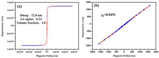 The magnetic hysteresis curve as well as a magnetization curve at low fields of the amorphous-based MFs are shown in Figure 5. The MF exhibits a superparamagnetism property with a MS of 12.6 kA/m. We obtained the magnetic particle volume fraction φ (φ = 2.8 ν/V) through fitting the Langevin function which is weighted by the lognormal size distribution. The magnetic core diameter Dmag of the amorphous Fe-Ni-B particles in MFs is 12.8 nm with a geometric deviation of Lnσg = 0.24. In addition, the magnetization curve at low fields of the amorphous MFs demonstrate that the χ0 is 0.8491, indicating the easy magnetization properties of the amorphous Fe-Ni-B MF.