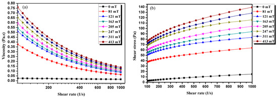 Viscosity vs. shear rate curves under various magnetic fields is displayed in Figure 6a. The viscosity of the Fe-based amorphous MF was measured at 25 ℃. The sudden change in the shear rate and magnetic field could induce the instantaneous effect. To avoid this, we conducted a pre-shearing measurement for 300 s at a shear rate of 11 s−1 without an applied magnetic field. Then, a shear rate of 5 s−1 for 10 s with a specified magnetic field was applied, which was then followed by a shear rate ramp range from 100 to 1000 s−1. It is noted that shear thinning phenomena were observed from the curves, where the viscosity decreased with increasing shear rate under different magnetic fields. This shear thinning behavior is associated with the microstructural change in the MF [31]. Initially, there were column-like structures in the MFs. The large column-like structures break into smaller ones or single chains with increasing shear rates, resulting in lowered viscosity of the MFs. The shear stress vs. shear rate curves are displayed in Figure 6b. It can be seen that the shear stress raised with the increase in magnetic field strength. The shear stress was shown to be dependent on the shear rate once a constant magnetic field was applied to the MF. These amorphous MFs exhibit characteristics similar to that of a Bingham plastic fluid.