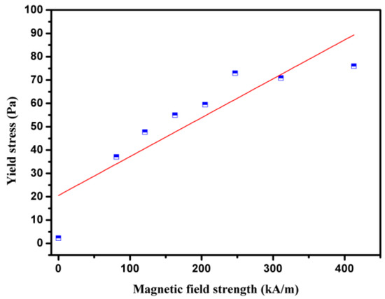 Yield stress is a crucial element in judging whether an MF is suitable, particularly for commercial uses. The yield stress of Fe-based amorphous MFs as a function of magnetic field is shown in Figure 7. It was found that an increasing magnetic field causes increases in yield stress. This is due to the fact that the field-induced chain-like or drop-like structures restrict the fluid more with increasing the magnetic field, which thereby improves the magnetorheological effects of the Fe-based amorphous MFs.