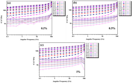Dynamic oscillatory testing was conducted under angular frequency sweep. Storage modulus G′ and loss modulus G″ were characterized as a function of frequency at room temperature under angular frequency sweeps of 0.1–100 rad/s at 0.1%, 0.5%, and 1% strain. The results are shown in Figure 9. The storage modulus G′ is concerned with the capacity of the material to store energy as soon as an oscillatory force is applied and the loss modulus G″ is concerned the ability of the material to lose energy [32]. We can see that solid-like behavior (G′ > G″) was observed from the dynamic oscillatory responses. The results indicate that Fe-based amorphous MFs have a strong ability to store energy especially under applied MFs.