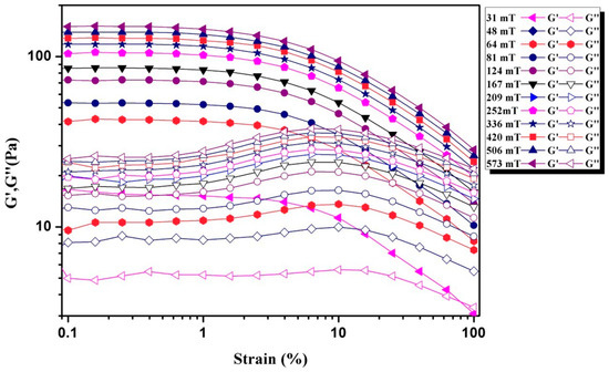 Storage modulus G′ and loss modulus G″ were also measured to study the viscoelastic behavior of Fe-based amorphous MFs. The variation in storage and loss moduli with respect to strain amplitude at an angular frequency of 10 rad/s is shown in Figure 10. It can be seen that the storage modulus G′ is greater than the loss modulus G″ at a low strain. Then with increasing the strain, the storage modulus G′ decreases to less than the loss modulus G″ after a certain critical strain. Moreover, the critical strain point moves to a larger strain with rising magnetic field. The elastic effect is dominant over the viscous effect at low strain, resulting in higher storage modulus, thereby indicating the existence of stronger connections between the magnetic nanoparticles. In other words, the magnetostatic forces play a more prominent role than the hydrodynamic forces at this stage. However, the phenomenon reverses with increasing strain. The hydrodynamic forces became dominant over the magnetostatic forces because the viscosity effect of the fluid exceeded the elastic effect and the magneto viscoelastic effect became reduced. Moreover, the magnetic fields have obvious effect on the magneto viscoelastic effect of the MF, leading to the critical point shifting to higher strain.