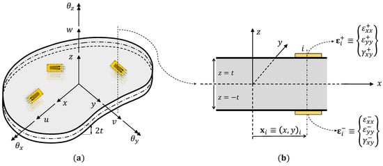 Illustration of the plate structure: (a) kinematic variables used to represent the deformations, and (b) strain sensors instrumented on the top and bottom surfaces of the plate.