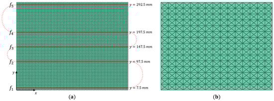 The carbon–epoxy composite plate used for the study (shown in Figure 2) has a length mm, width mm, thickness mm, and is built of eight equal-thickness layers with a symmetric material layup (0/45/–45/90). The lamina material properties are provided in Table 1. The plate is initially modelled with a delamination of size mm at the interface of the first two layers (–), and located at = (155,195) mm. The effect of the delamination position is studied later on in this section.