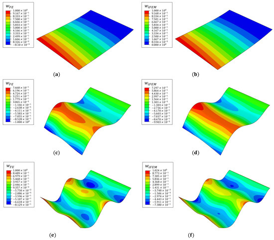 Among the vibrational mode shapes, plate bending offers the highest potential for exciting the delamination and generating local strain perturbations. Also, as the fiber measures only longitudinal strains, iFEM accuracy for reconstructing the bending mode shapes is expected to be greater than for the in-plane or torsional modes. Alternatively, strain rosettes can be used instead of fiber optic sensors. In this case, the availability of triaxial strains is expected to produce more accurate results, with its associated difficulties of instrumentation and wiring. Given these practical considerations and the marginal gain in accuracy for the bending modes, fiber optic sensors are considered the ideal choice for the present study. The first three bending modes are considered: mode 1 at 17.15 Hz, mode 8 at 301.8 Hz, and mode 14 at 590.7 Hz. The iFEM analysis uses strains measured by all five sensing lines (). For all elements with no strain measurements, a low value of weighting coefficient () is used to formulate the corresponding element error functional. The contour plots of iFEM mode shapes compared against the reference FE results are shown in Figure 4.