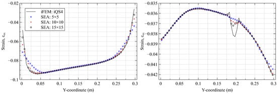 Three smoothing mesh discretization schemes are used for this study, with 5, 10, and 15 subdivisions along the plate edge, respectively. The meshes use the three-node smoothing element SEA3 [52] arranged in a cross-diagonal pattern as shown in Figure 3. Similarly, among the hyper-parameters, only is analyzed because it directly affects the continuity of the smoothed strains. As the analysis does not use noisy data, parameter is set to a small value (). Two key features characterize an ideal SEA analysis: accurately capturing healthy or undamaged strains across the plate and filtering or smoothing the strain peaks and discontinuities near the damage site. The influence of the mesh on the SEA results is shown in Figure 5, where it is compared against the reference iFEM strains. The choice of an optimal mesh is a difficult balance between a low-fidelity mesh that smooths over both healthy and damaged strain peaks and a high-fidelity one that accurately captures both. The results of Figure 5 highlights the mesh to be an ideal compromise.