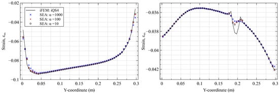 iFEM and SEA results (using 15 × 15 SEA3) for various values of compared along (left) the plate root ( mm) and (right) across the delamination ( mm).