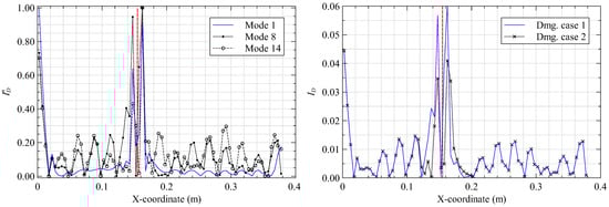 Damage index plots along mm for (left) damage case 3 and (right) mode 8.