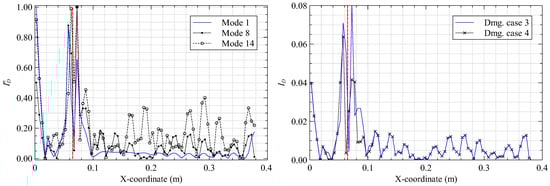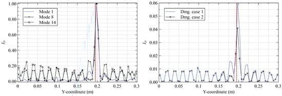 Damage index plots along mm for (left) damage case 1 and (right) mode 8 (the vertical red line indicates the damage site).