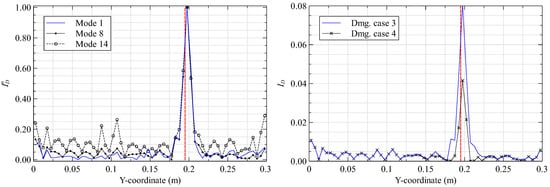 The iFEM results of Section 3.1 are smoothed using the SEA3 smoothing mesh to establish a healthy baseline. Subsequently, the damaged and baseline results are used to compute the damage index () based on Equation (10). Four different damage cases, varying the in-plane and through-thickness (inter-lamina) position of the delamination, are investigated to understand the effect of damage location on the proposed strategy. These cases are described in Table 2. Additionally, delamination detection as a function of the reconstructed vibrational mode shape is studied. The results from these studies are presented as line plots of along sections that intersect the damage location: mm and mm for cases 1 and 2, and mm and mm for cases 3 and 4. These results are shown in Figure 7, Figure 8, Figure 9 and Figure 10.
