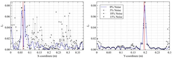 Damage index plots along (left) mm and (right) mm for different noise levels.