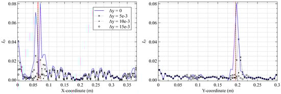 A final study investigates the influence of sensor proximity to the delamination on damage detection. Previous iFEM analyses used in-situ strains based on Figure 3, where fiber line overlapped the delamination. Various new sensor configurations are simulated by shifting the position of fiber lines and symmetrically outward from the central line . The parameter represents the change in the vertical coordinate with respect to the original fiber position. Line is shifted from mm, where it is still within the delaminated region, to mm, where it is no longer in contact with it. The present study also investigates plate vibrating under mode 8 with a damage based on case 3. The results are shown in Figure 13.