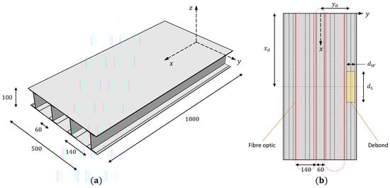 Illustration of the composite wing box showing the (a) geometric dimensions, (b) position of the fiber optic sensors, and the debonded area on the top skin (all dimensions are in mm).