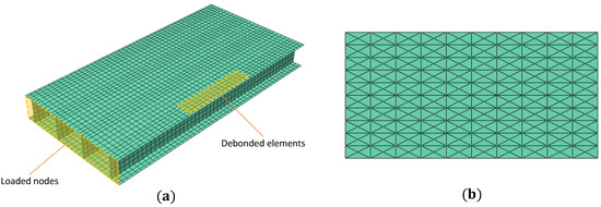 A high-fidelity FE model of the wing box is developed in ABAQUS to simulate its mechanical behavior. The wing box is modeled using 5600 S4R elements, as shown in Figure 15. Over the debonded region, the skin and the spar cap are meshed separately using 64 shell elements, with displacement and rotation continuity maintained at the debond junctions [54]. An additional contact constraint is also introduced between skin and spar elements to avoid intersections during deformation. The FE strains are used as inputs for the iFEM analysis, and the FE displacements are the reference for comparisons. The iFEM model uses the same element discretization scheme as the direct model but employs the inverse shell element iQS4 [25]. Only the upper and lower skins of the wing box are assessed for debond detection, where the iFEM results are smoothed using a SEA3 smoothing mesh shown in Figure 15.