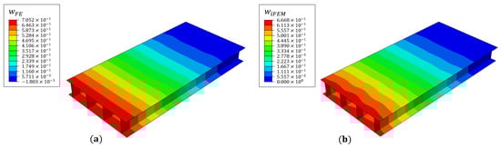 Deflection contours of (a) FE and (b) iFEM results for damage case 1 (units in mm).