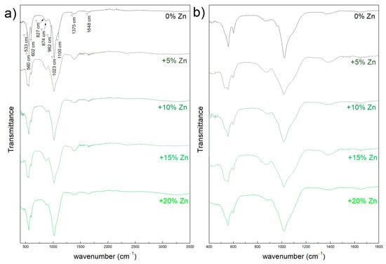 FTIR spectra of the obtained materials: without Zn (0% Zn) and with 5, 10 and 15 molar % of Zn ranging from: (a) 400–3500 cm−1, (b) 400–1800 cm−1.