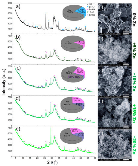 The morphological changes in the samples are seen in Figure 2a′–e′. It can be seen that the sample without Zn additive is composed of large, flake-like aggregated structures. Even the smallest zinc ion content strongly affected the crystals’ shape and size. In the structure of the product with 5% initial Zn content, fine, irregular flakes of smaller size all stuck together are noticeable. Particle size decreased with increasing Zn content in the materials. However, further Zn content increases resulted in the formation of agglomerates with a cauliflower shape, where the crystals merged with each other. In the case of samples with an initial zinc content above 10%, the structure of the material became more compact. Changes in the morphology of the obtained materials were reflected in the values of the specific surface area as well as the size and volume of pores, as shown in Table 1 and Figure S1. Replacing 5 mole % of Ca with zinc ions caused the BET surface area to increase from 36.3 m2/g to 80.1 m2/g. With a further increase in the Zn content, the surface area gradually decreased to 56.0, 30.0 and 25.2 m2/g, respectively, with an initial Zn of 10%, 15% and 20%. Total pore volume, micropore volume, pore diameter and pore size distribution were subject to similar changes. It seems that the merging of particles into agglomerates eliminates the positive effect of increasing the surface area and pore volume, associated with the formation of smaller crystallites in the presence of Zn.