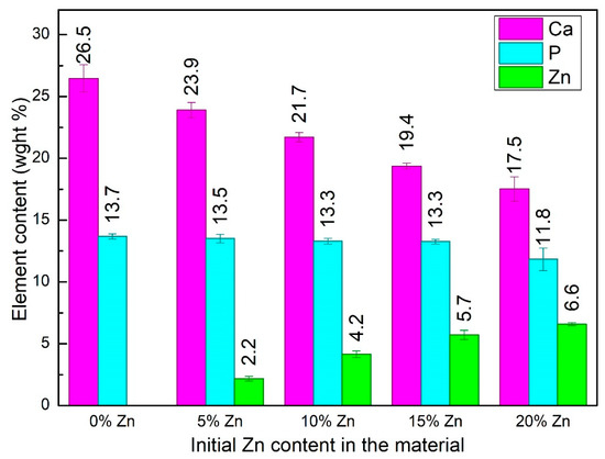 Zn, Ca and P content in the obtained materials.