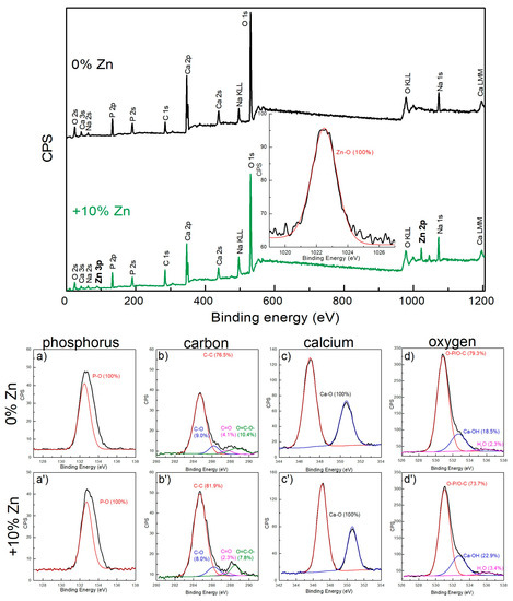 The XPS results along with the (a,a′) P2p, (b,b′) C1s, (c,c′) Ca2p and (d,d′) O1s XPS peaks in the samples (a–d) without (0% Zn) and (a′–d′) with 10 molar % of Zinc in the precursors (+10%Zn).