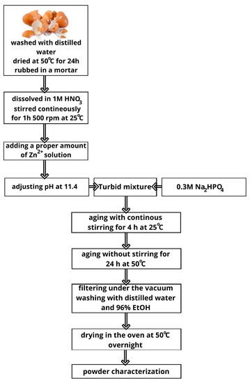 The hen eggshells collected from the residential neighborhood of Lublin were washed in distilled water and dried at 50 °C. The calculated number of eggshells were dissolved in 1 M nitric acid and stirred using a magnetic stirrer at 500 rpm for one hour. Then, the initial pH value was adjusted to 11.4 using a 1 M sodium hydroxide solution. Next, a 0.3 M Na2HPO4 solution was added dropwise to the obtained solution using a peristaltic pump with a flow rate of 20 mL/min and the suspensions were stirred for 4 h using a magnetic stirrer at 500 rpm at 25 °C. The stoichiometric molar Ca/P ratio was kept at 0.6 and the sample was denoted as 0% Zn. The calcium content in the eggshells was assumed on the basis of previous DTG studies to be 95% [14]. Then, the prepared mixtures were subjected to the aging process in an oven at 50 °C for 24 h, then filtered through vacuum filtration using membrane filters with a pore size equal to 0.45 µm, rinsed with Milli-Q water and ethanol and dried overnight at 50 °C (Scheme 1).