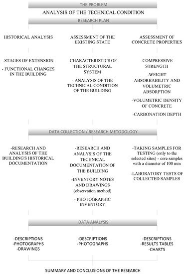 When planning the analysis of the technical condition of the building, access to individual structural elements was taken into account, which can often be limited due to geometry and location. Currently, preparatory works are being carried out on the premises, as part of the planned reconstruction and modernization of the facility. The purpose of this research was to analyze the technical conditions, and the study process was divided into three main areas: historical analysis, analysis of the existing conditions, and assessment of concrete properties, according to the scheme shown in Figure 1.