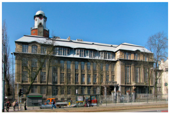A former school building, the German Reformed Gymnasium (Figure 2) is located in the downtown area of Łódź, at 65 Tadeusza Kościuszko Avenue. It exemplifies features of Berlin Modernism and elements of Art Nouveau (Figure 3). The building isincluded in the register of historical buildings of the city of Łódź, item number A/307.