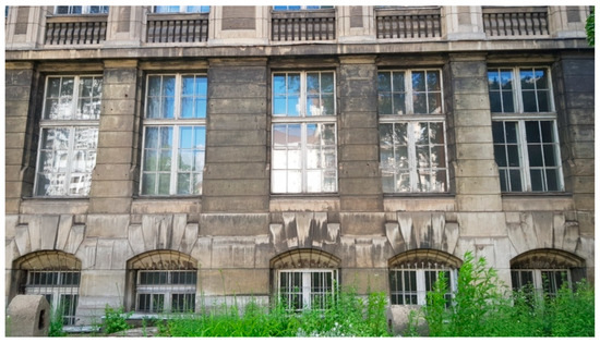 The main school building (building A, Figure 4) was constructed between 1909 and 1910. The building was originally designed on an inverted L-letter plan and its outline varied with avant-corps of different depths. The design was the work of the well-known Berlin architect Otto Herrnring, who specialized in the design of educational buildings; as a result, the building has been called a “model” school building of the time. The structure was one of the first public buildings in Łódź to use a reinforced concrete monolithic frame.