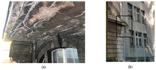 The facades show numerous cracks in the masonry and cavities. The plaster is in a very bad condition. Superficial defects in the plaster are visible, due to the large cavities and damaged flashings (i.e., window sills and gutters), which have caused individual layers to separate, exposing the bricks in permanently damp areas. The increased moisture from rainwater has caused biological corrosion of the plaster, manifesting itself in crumbling, delamination, and peeling, and consequently in the plaster falling off the brick wall (Figure 6).