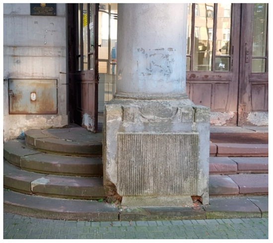 The architectural details on the building’s facades are very rich and varied. In terms of their construction material, they can be divided into two groups. The first group includes moldings made of cement–lime mortar, and the second group consists of reliefs made of artificial stone (gypsum mortar).