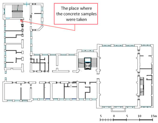 An important part of the material diagnostics is an assessment of their condition within the structure. Progression of corrosion processes depends primarily on the internal structure of the medium, namely the hardened structure of concrete, and the amount of moisture it contains [18]. Corrosion processes can cause adverse changes in the structure of concrete by increasing its porosity. Under the influence of, for example, mechanical dead loads, micro-cracks form that facilitate the migration of corrosive agents into the concrete. Inside buildings, concrete is particularly exposed to CO2. An important part of concrete diagnostics, especially in a more than 100-year-old structure, is the evaluation of its physical–mechanical and durability characteristics, including tests of the progress of carbonation in floor slabs.