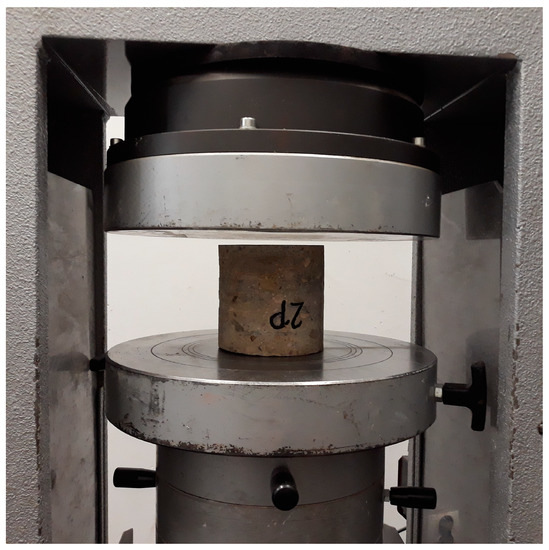 The tests were conducted on core samples of diameter 100 mm and length 100 mm. The number of borehole samples that may be taken from historic structures may be limited; however, according to [19,20], it can range from 3 to 14 samples. The strength test was performed on the borehole samples according to standard [21]. The samples were prepared according to the requirements set forth in the standard, by grinding the outer surfaces of the cores to ensure that they were parallel. Figure 11 shows a core borehole in a strength-testing machine.