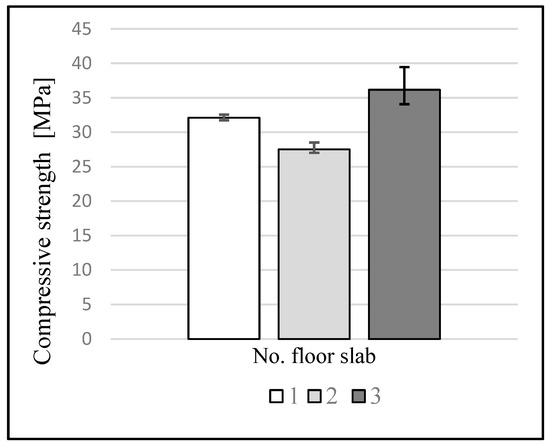 The average compressive strength (for three samples) determined for the three analyzed floors was in the range of 27.5 to 36.5 MPa.