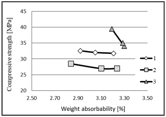 The relationships between the weight absorption and the compressive strength were determined. The results of the analyses are shown in Figure 13.