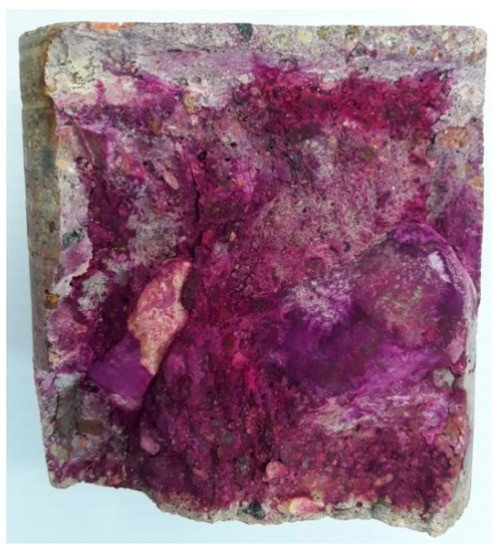 A photograph showing a concrete fracture with a phenolphthalein solution applied.