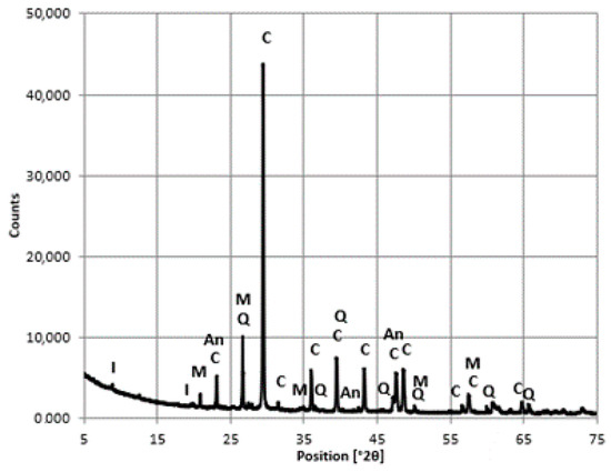 The diffractogram of the aggregate. Designation: I—illite, M—muscovite, Q—quartz, C—calcite, An—anorthoclase.