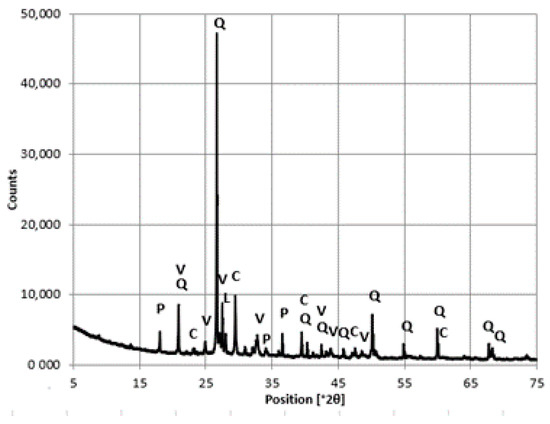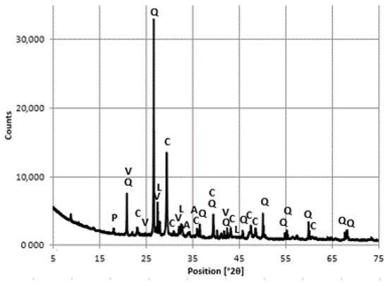 A diffractogram of the cement slurry from the concrete samples, top floor slab layer. Designation: P—portlandite, V—vaterite, A—aragonite, C—calcite, Q—quartz, L—larnite.