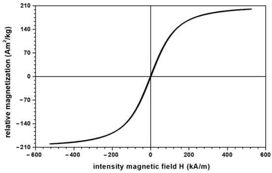 - Microparticles of carbonyl iron (CI) from Sigma-Aldrich Chemie GmbH (Taufkirchen, Germany), product code C-3518, with a minimum purity of 99.7% and an average diameter at a temperature of 24 °C. The electrical resistivity of CI microparticles is at a temperature of 20 °C, and the bulk density of CI microparticles is at a temperature of 22 °C. From the magnetization slope of CI microparticles, recorded using the experimental set-up described in [23], we measured the relative saturation magnetization as at (Figure 1).