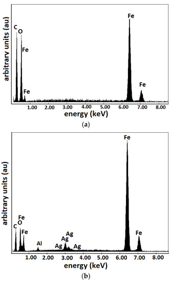 The results are represented in Figure 4 and Figure 5. The random distribution of microfibers in the base liquid (honey) can be observed in SEM images of the cotton fabric microfibers with honey (Figure 4a). From Figure 4b, it can be seen that the metal particles adhere to the microfibers and have entered the spaces between the cotton microfibers through capillarity action. From Figure 5, it can be seen that the membranes are of high purity. Membrane contained C and O atoms. Similarly to , membrane contains C and O atoms but also Fe atoms from the CI microparticles. It can be seen that membranes and (Figure 5b) contain C, O, and Fe atoms, similar to membrane , with additional Ag atoms from SmP microparticles.